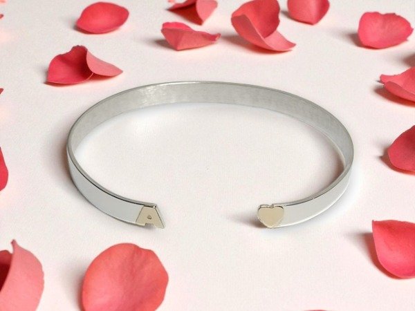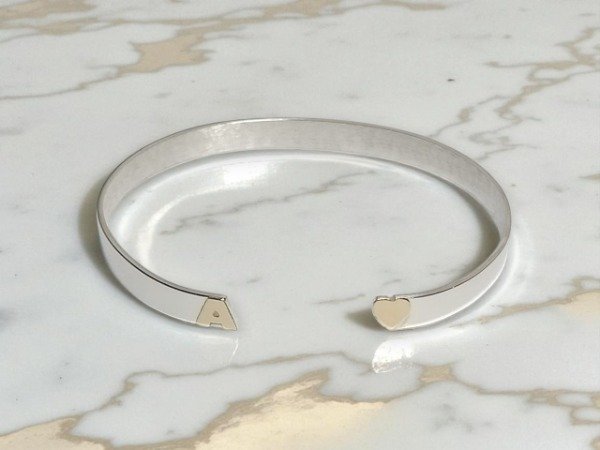 PULSERA RIGIDA TIPO PINZA PLATA 925 CON INICIAL Y CORAZÓN ORO 18K.